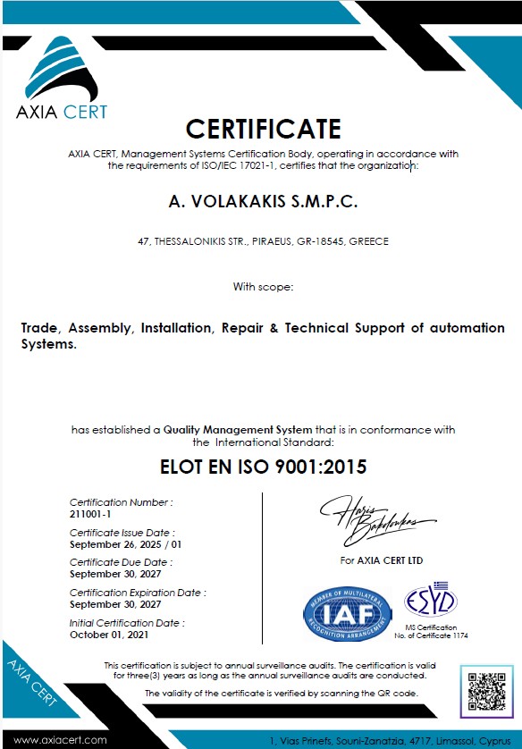 SHIPSPEC is certified in compliance of EN ISO 9001:2015 for: Manufacture, Trade and Technical support of Automation Systems.